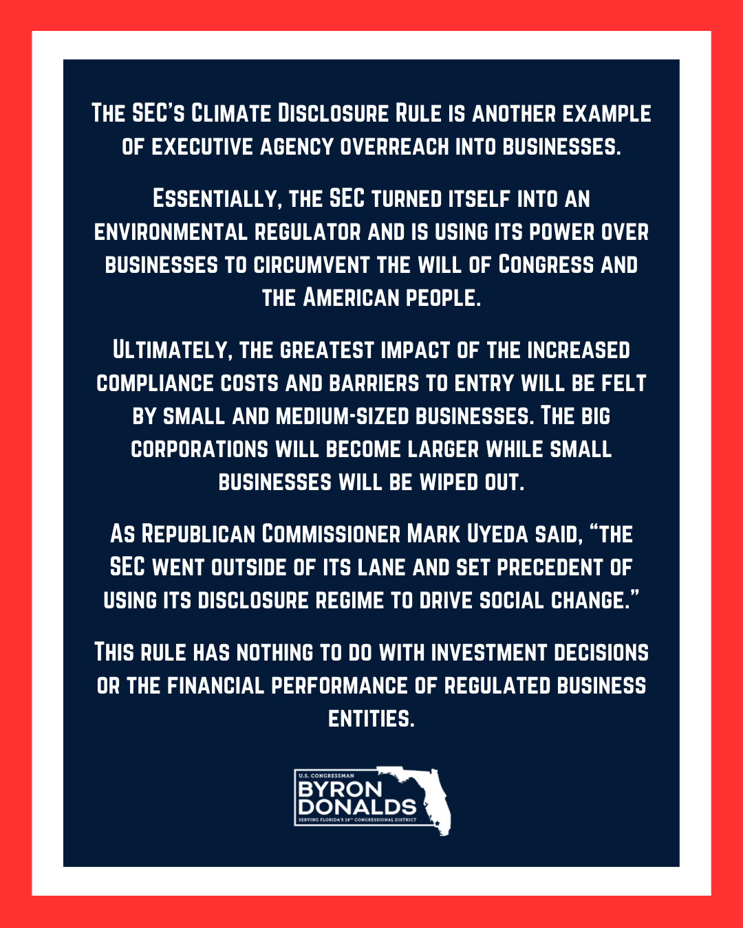 You may have missed it, but last week, the SEC released a new Climate Disclosure Rule. This is another example of executive agency overreach into businesses. Essentially, the SEC turned itself into an environmental regulator and is using its power over businesses to circumvent the will of Congress and the American people. Ultimately, the greatest impact of the increased compliance costs and barriers to entry will be felt by small and medium-sized businesses. The big corporations will become larger while small businesses will be wiped out. As Republican Commissioner Mark Uyeda said, 'the SEC went outside of its lane and set precedent of using its disclosure regime to drive social change.' This rule has nothing to do with investment decisions or the financial performance of regulated business entities.